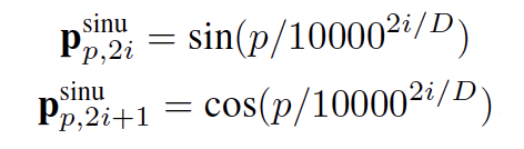 positional encoding 최종 positional vector는 위의 scale factor를 height와 width의 sinusoidal positional encoding에 곱해줌으로써 결정지어집니다. sinusoidal positional encoding은 위와 같이 계산됩니다. 여기서 p는 position에서의, i는 hidden dimension에서의 인덱스값입니다. D는 총 hidden dimension 값입니다.