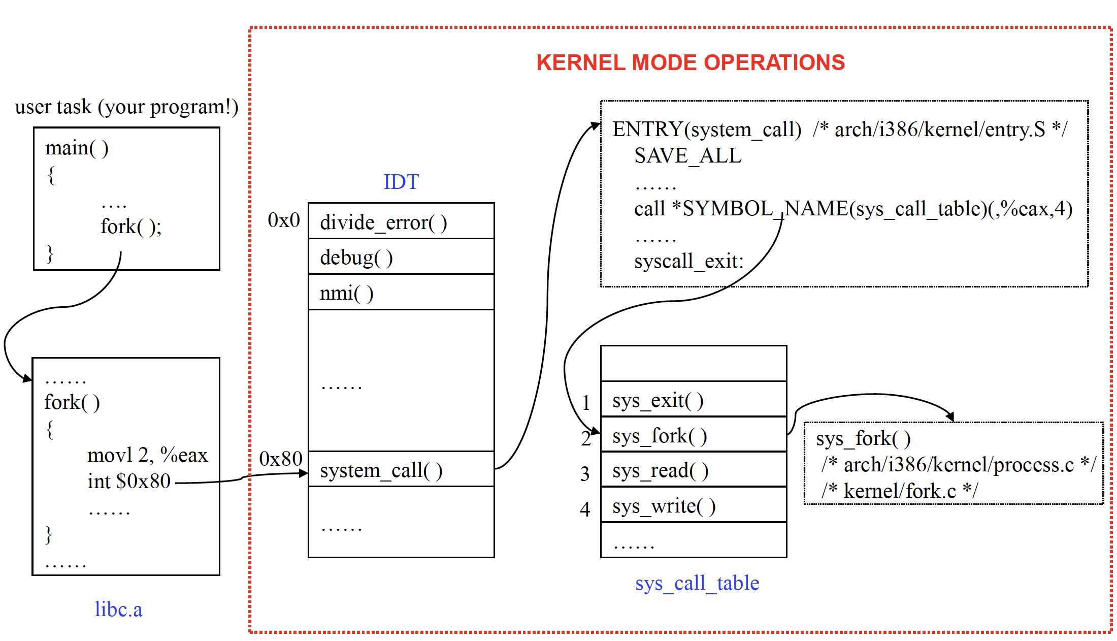 - fork()가 호출됐을 때, 리눅스의 표준 라이브러리인 libc.a에 wrapper function의 형태로 구현돼있는 fork()로 점프한다.