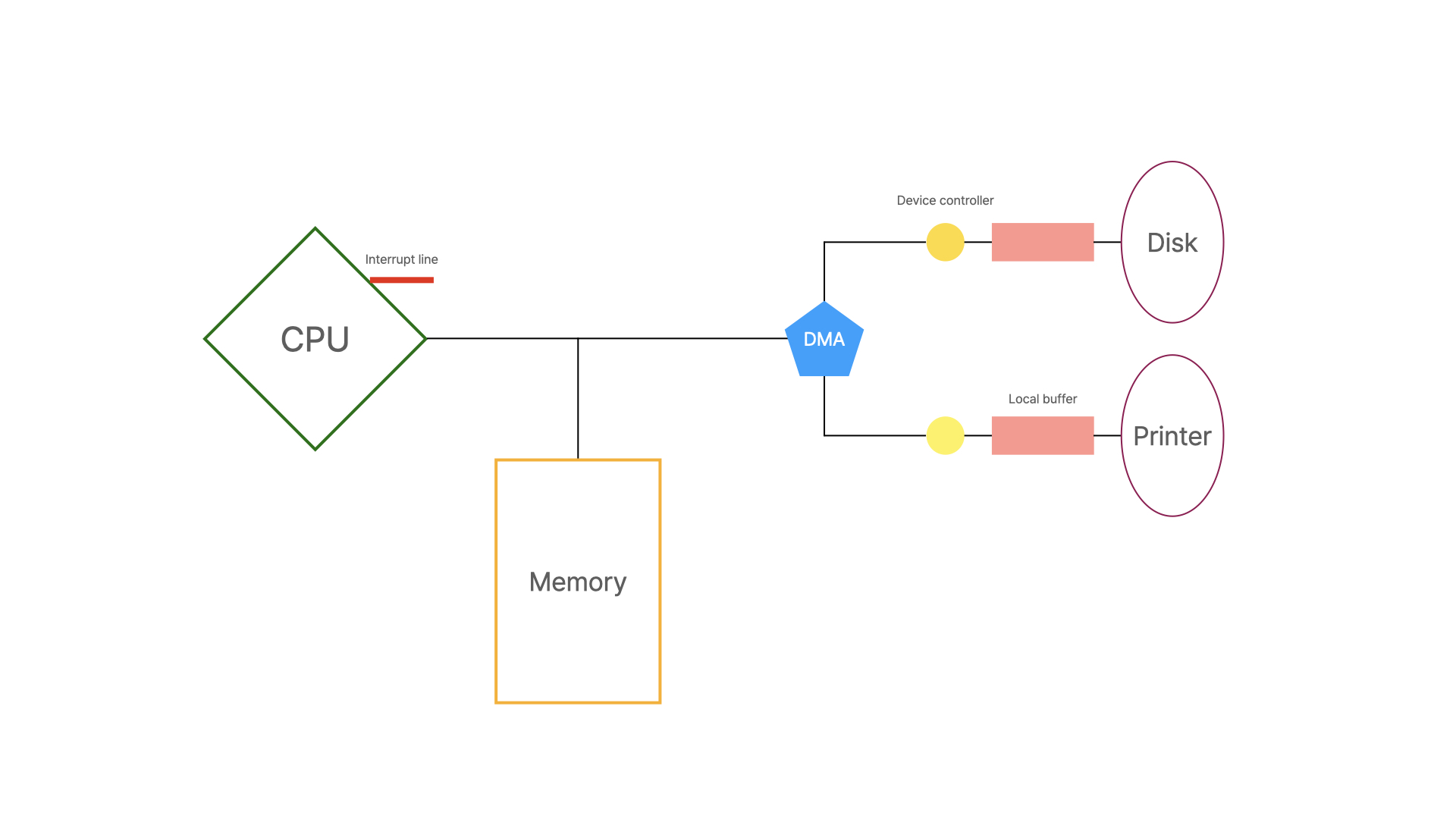 DMA(Direct Memory Access) Controller CPU가 Memory에 있는 Instruction들을 수행하고, 와중에 Disk나 Printer 등 I/O Device들의 작업이 완료되면 Device Controller가 Interrupt를 걸고, CPU가 Local Buffer에 있는 내용을 Memory로 옮기게 된다. 하지만 이런 식으로 작업을 진행할 경우 CPU에 과도한 Interrupt가 걸린다는 문제가 있다. 이에 따라 DMA(Direct Memory Access) Controller가 Local Buffer에 있는 결과물을 Memory에 옮기는 일을 수행하고 완료되었을 때 CPU에 Interrupt를 걸게 된다.