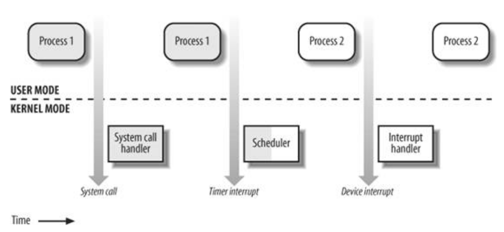 User Mode와 Kernel Mode Processor Register에 있는 mode bit으로 mode가 전환되는데, mode bit이 0일 때 구동되는 Kernel Mode와 1일 때 구동되는User Mode가 있다. Kernel Mode는 OS 단에서 처리해야 할 명령어들을 수행한다. 예를 들어 User Application에서 시스템 콜을 통해I/O 작업이 요청되었을 때 I/O 작업을 수행한다거나, Timer Interrupt가 발생했을 때 스케줄러를 수행한다든지 하는 명령들이다. 이와 같이 OS를 통해서 critical한 작업들을 수행함으로써 컴퓨터는 Application에서의 악의적인 코드나 잘못 짜여져 컴퓨터 리소스를 낭비하게 된는 상황으로부터 보호받게 된다. User Mode는 이러한 Previleged Instruction을 수행할 수 없는 모드이다. 일반적인 User Process를 수행할 때 사용된다.